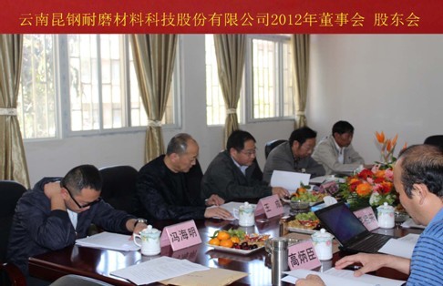 2012年3月24日,云南昆鋼耐磨材料科技股份有限公司首屆董事會(huì)第七次會(huì)議、股東會(huì)第五次會(huì)議在黑林鋪前街59號(hào)團(tuán)鋼廠院內(nèi)(原團(tuán)鋼子弟小學(xué))3樓會(huì)議室勝利召開。會(huì)議由董事長(zhǎng)李亞鵬召集和主持,云南昆鋼重型裝備制造集團(tuán)有限公司董事長(zhǎng)兼總經(jīng)理黃開萬(wàn)、昆明新云欽耐磨材料總廠董事長(zhǎng)馮煥欽、昆明理工大學(xué)材料科學(xué)與工程學(xué)院院長(zhǎng)蔣業(yè)華等董事及云南昆鋼耐磨材料科技股份有限公司領(lǐng)導(dǎo)出席了會(huì)議。